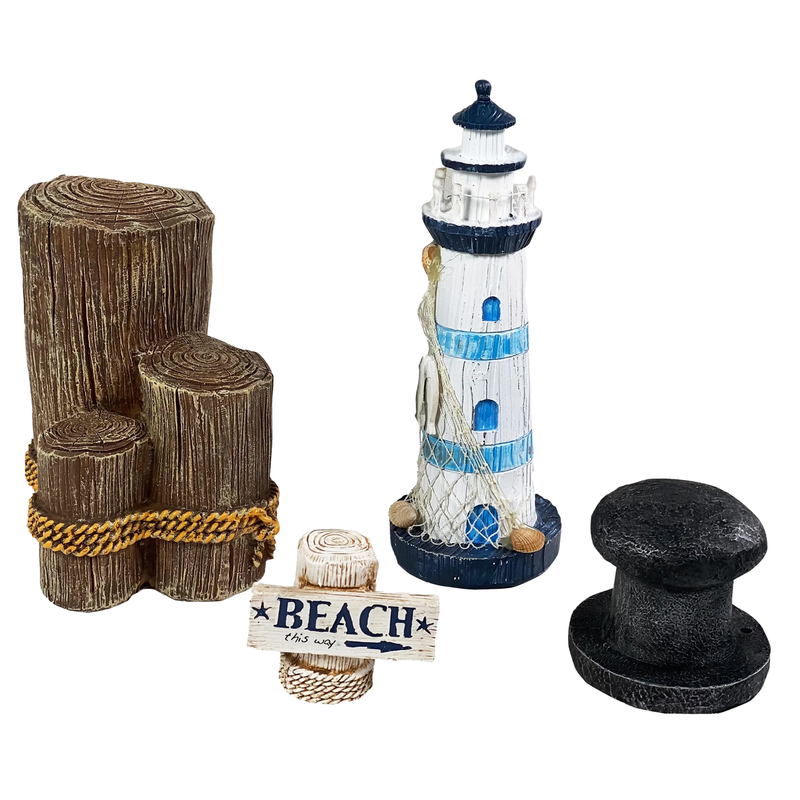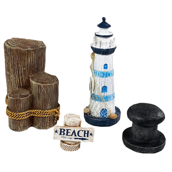 - Includes 4 finely detailed and fully colored decorations: a lighthouse, mooring bollard, dock pilings, and a beach sign.