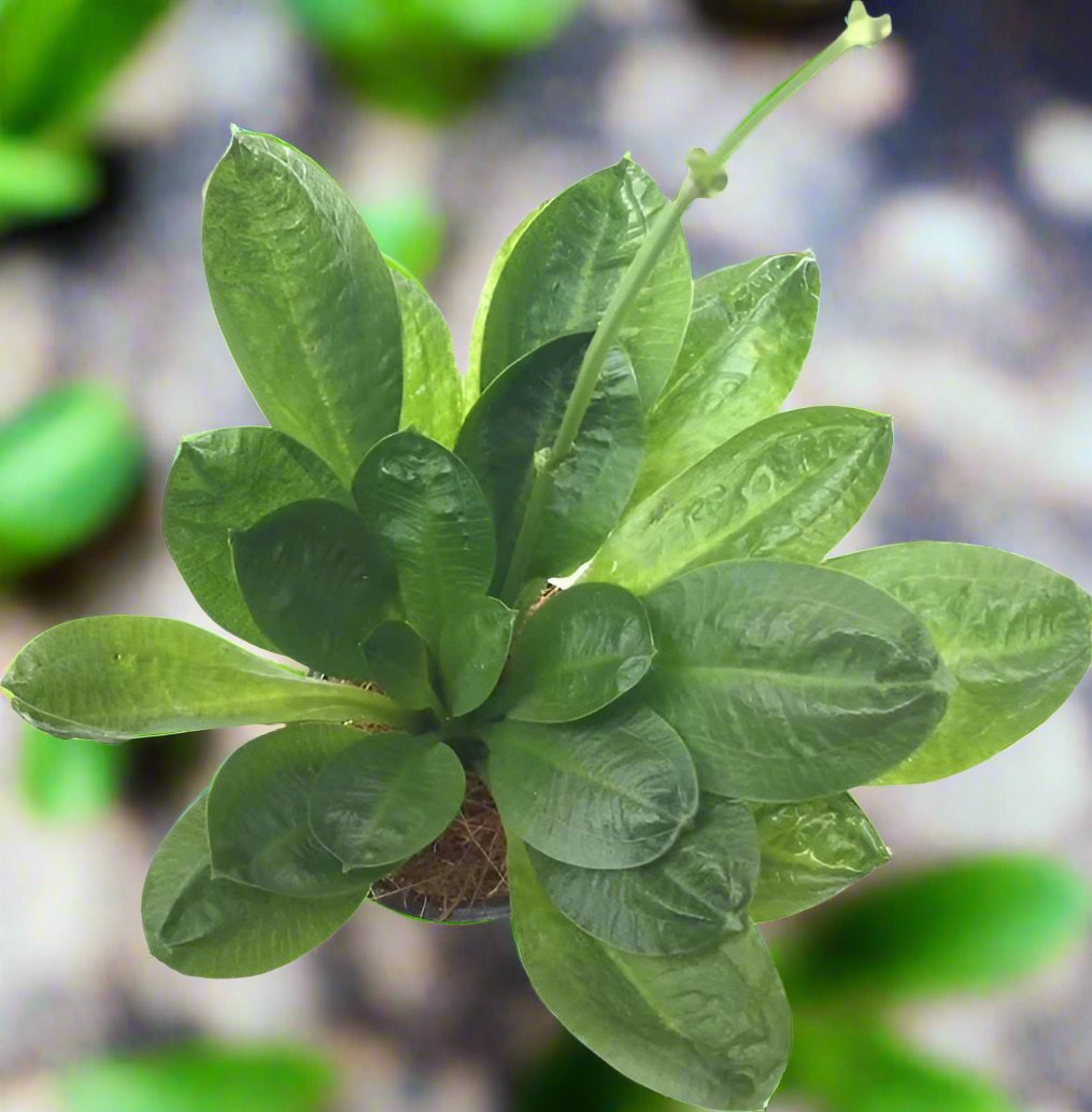 Echinodorus grisebachii 'Tropica', also known as Echinodorus parviflorus 'Tropica', is a small, distinctive sword plant that was discovered in the Tropica nursery in Denmark during the 1980s. This plant is well-suited for the foreground or middle ground of aquariums due to its compact size, which typically ranges from 5 to 10 cm in height. It forms a spreading rosette of medium to dark green, slightly bullate leaves that are narrow and obovate, resembling Samolus valerandi.
