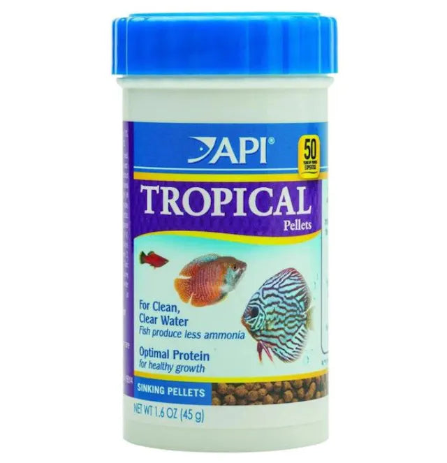 API TROPICAL PELLETS contains high-quality proteins – including squid and shrimp – for optimal growth, and perfects palatability with garlic. API TROPICAL PELLETS are designed specifically for tropical community fish such as Angelfish, Tetras, and Barbs, and contain a unique, nutritionally-enhanced protein to ensure easy uptake of nutrients for maximum absorption. Fish more readily use the nutrients in our high-quality formula, and as a result, release up to 30% less ammonia than the leading competitor for cleaner, clearer water. API TROPICAL PELLETS may be used as an equally nutritious, alternative tropical food to API TROPICAL FLAKES, depending on your fish’s preference. As an example, larger fish may prefer pellets to flakes because of their density, compared with smaller fish that may more easily consume the light texture of flakes.