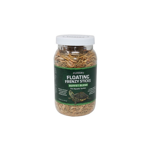 Feed to juvenile or adult aquatic turtles 1-2 times per day, 6 times per week. For best results, feed only the amount that the turtles will consume in 5 minutes. Flukers Floating Frenzy Sticks Buffet Blend should be scattered on the water, where it will float. Remove any uneaten food with a net after 1 hour. Flukers recommends a diverse diet for your aquatic turtles. Flukers Canned River Shrimp and Crafted Cuisine Turtle Diet can be used in conjunction with Flukers floating Frenzy Sticks Buffet Blend for a diverse offering.