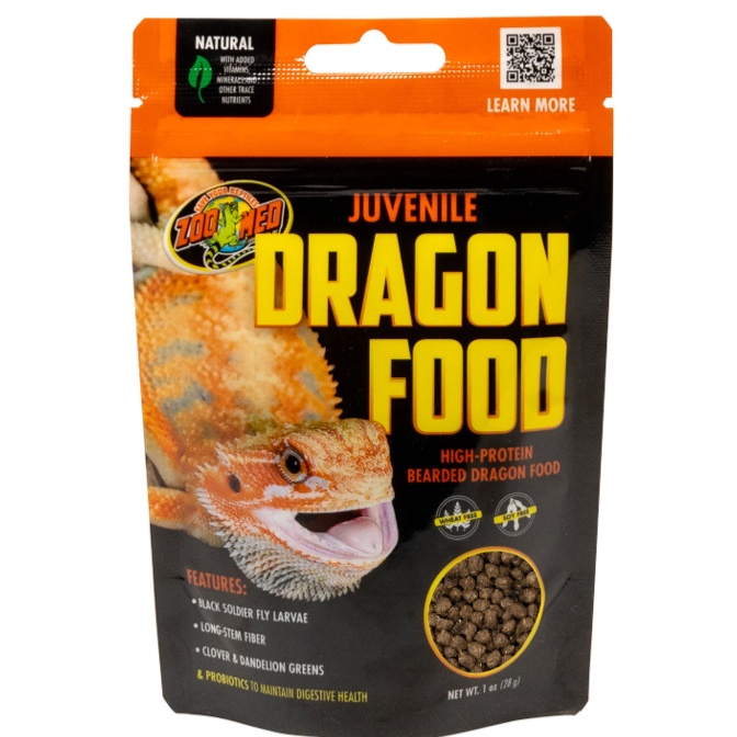• Use with juvenile bearded dragons up to 6 months old, then slowly transition them to Zoo Med’s high-fiber Adult Dragon Food. Feed 1 tsp every other day, increasing the amount fed as needed. Offer dry or very lightly mist with water to intensify aromas and help entice picky eaters. For variety, mix pellets with fresh greens and vegetables supplemented with ReptiVite™ and Repti Calcium®.