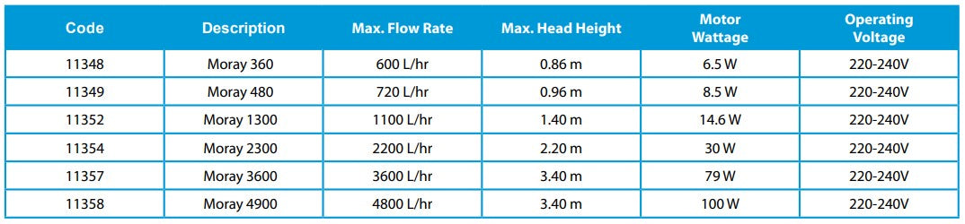 Aqua One Moray Aquarium Pumps provide water circulation and aeration in freshwater and salt water aquariums. The latest range of Moray pumps are energy efficient, quiet, reliable and are available in a range of sizes to suit various aquatic environments