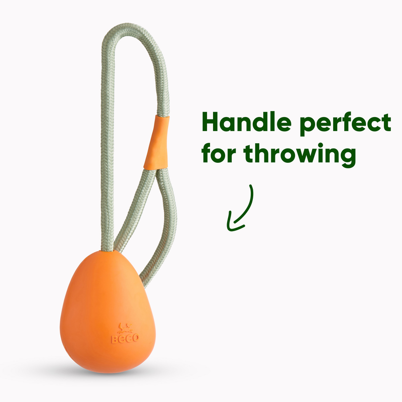 A natural rubber egg on a strong recycled rope. The springy natural rubber egg is easy for your dog to grip and the rope gives you extra throwing distance. Ideal for a game of fetch. The rubber has a gentle vanilla scent.