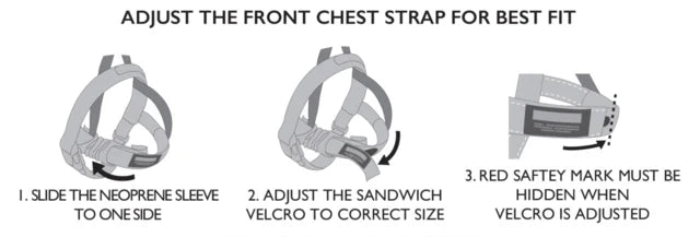 Once the belly strap fits, take the harness off your dog to adjust the one time chest adjustment, if needed. Slide the neoprene sleeve to one side and adjust the sandwich velcro. The red safety patch in velcro must be hidden.
