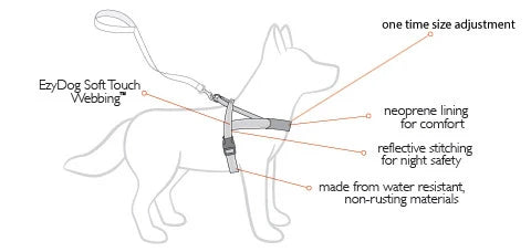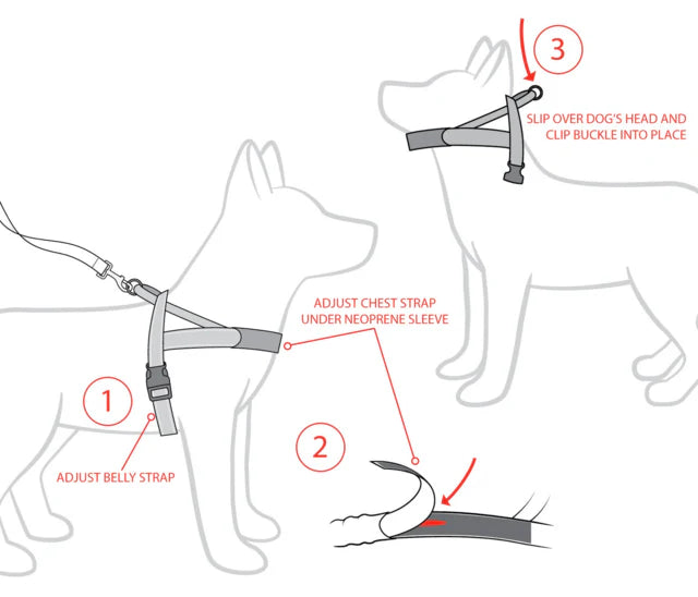 Slip harness over dog's head and adjust belly strap to proper fit. If the belly strap does not fit move to the next size.