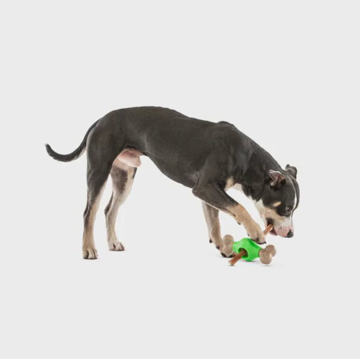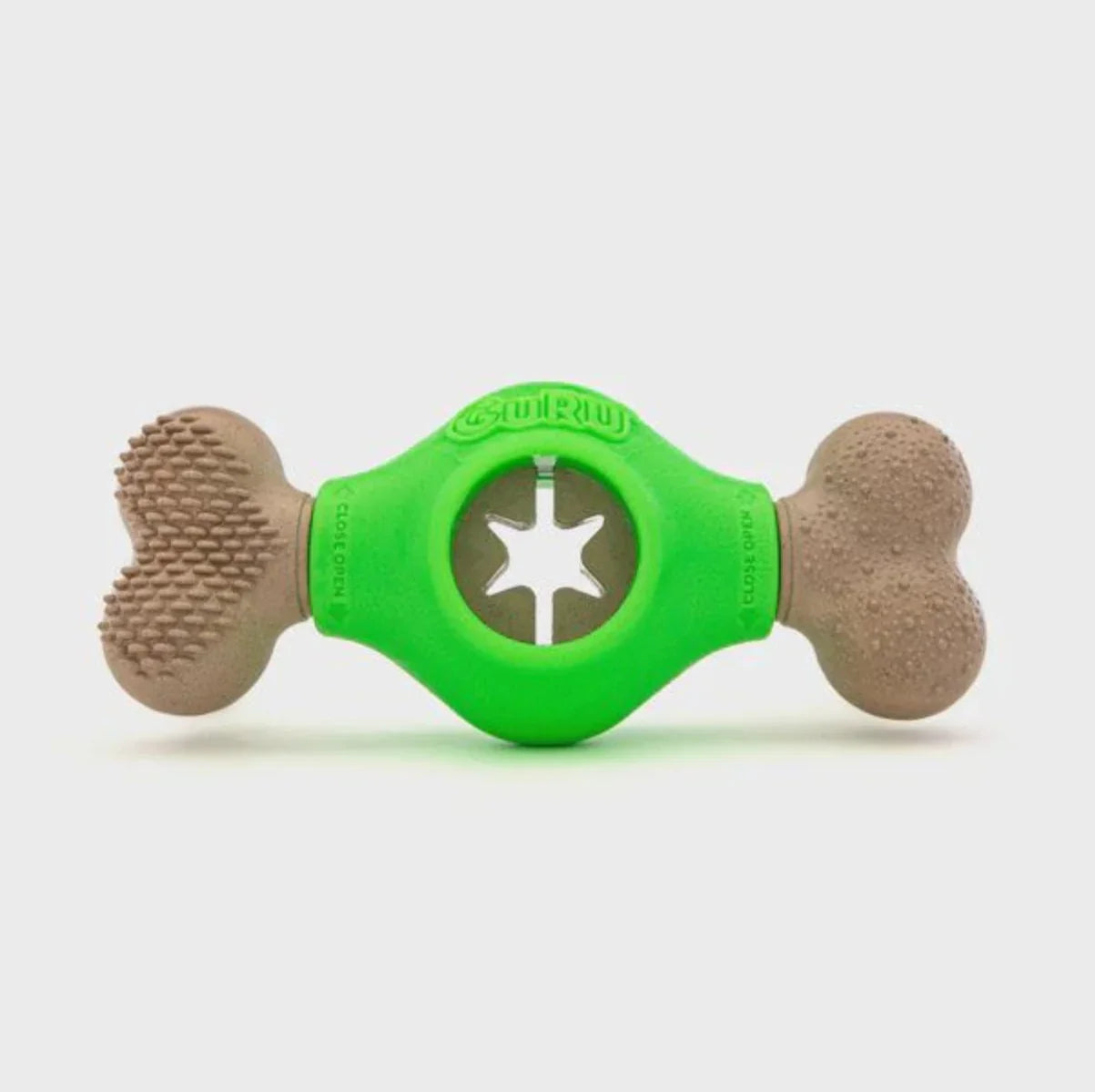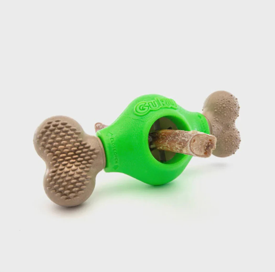 This patent-pending innovative toy twists and securely holds treats for safe and long-lasting play. For added fun and chewing satisfaction, the dog can move on to the Chew Perfect bone ends, which is GURU's non-toxic nylon wood bacon-scented chew material designed for a dog's safety and satisfaction. The Adjust-A-Chew also uses Clean and Polish; GURU's exclusive surface texturing designed to help clean and polish teeth.
