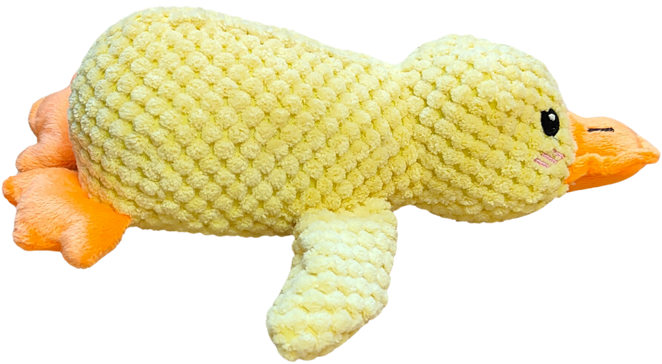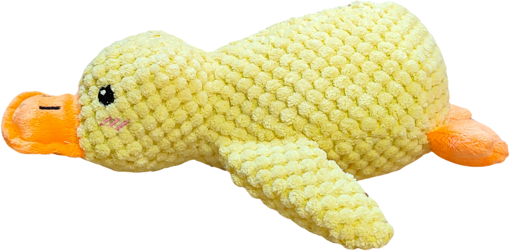 The Plush Yellow Duck Dog Toy is a soft, textured toy designed for gentle play and everyday interaction. Featuring a rounded duck shape with a plush outer, it is easy for dogs to carry, cuddle, and play with.