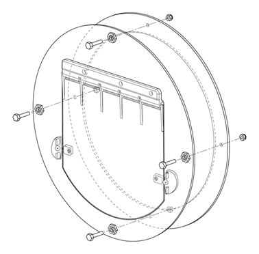 - The two main parts of the Dog Door are then clamped with the glass between. Use the four bolts supplied. Longer bolts are available in lengths of 30, 35 and 40mm. IMPORTANT! Assemble the door so that the frame with the flap is on the outside.